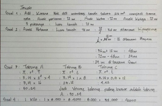 Pada soal nomor 3 ini siswa dengan gaya belajar kinestetis memiliki pengetahuan tentang konsep volume tabung yaitu V=πr2t.. Nilai jari-jari lingkaran (r) dan tinggi tabung (t) tidak dituliskan secara eksplisit di soal. Siswa dengan gaya belajar kinestetis mampu membaca soal dengan baik di mana siswa tersebut mengetahui nilai jari-jari lingkaran (r) dan tinggi tabung (t) dari gambar yang diberikan. Setelah itu siswa dapat menggunakan konsep volume tabung dengan data yang diperoleh sehingga siswa dapat memperoleh nilai volume masing-masing tabung dan dapat membandingkan volume masing-masing tabung.