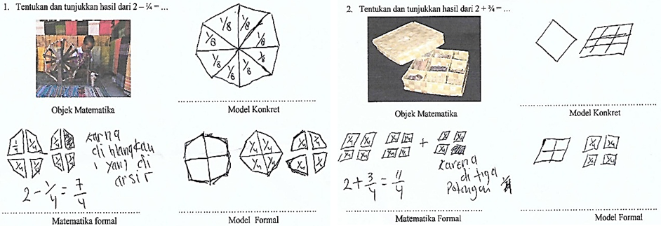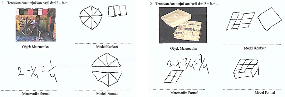 The work of students in Figure 2 shows that they could identify the focus of cultural objects (parane' and caraken) to represent the fractions and modify the second drawing at the stage of the formal model. The modifications made at the formal model stage are two octagons in which one is in intact form, and another is in a separate form divided into four parts. The drawings at the stage of the formal model represent 2 and 1/4 on the first problem. In problem 2, two rhombuses represent 2 and a rhombus which is divided into four by shading three of its part represent 3/4. The drawings at the formal model stage show the ability of students to represent fractions in the different forms (RC). The student’s correct answer up to the formal model stage is shown in Figure 2.