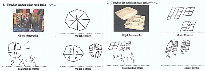 Based on the students’ work on the test, the characteristics of student answers at the stage of a concrete model is making a drawing that represents the concept of fraction relating to the cultural object. The drawing made only to show the mathematical concepts in the problem and have not shown its value. It is important to ensure that students understand the mathematical concepts in the problem to be worked on. At the formal model stage, drawings made to represent the value of numbers (fractions) in the problem. In the formal mathematics stage, drawings are made to represent evidence of solving the problem. Understanding connection shows the ability of students to understand the mathematical concepts in the problem. Representation connection reveals the ability of students to make different forms of the concept of fractions in the problem. Justification connection indicates the ability of students to prove in different representations of problem-solving.