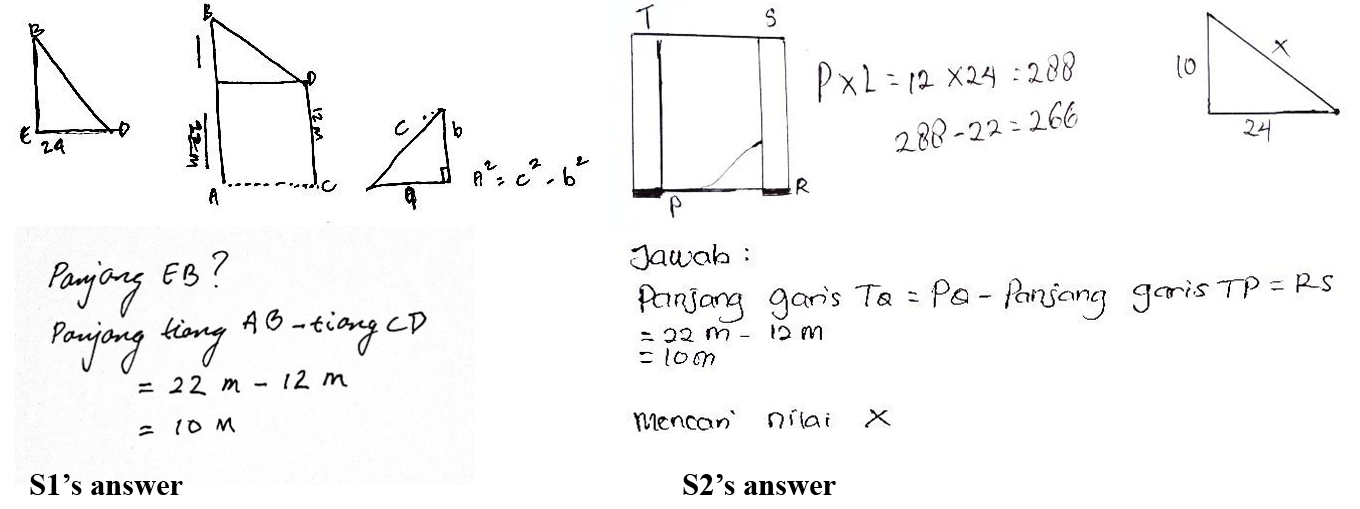 Both students were contemplating by giving attention to the previous stages, showing reactions, and comparing. They also could write and explain correctly how to implement the solution, step by step. In addition, they admitted that they had previously dealt with a seemingly similar problem. In this stage, the subjects applied two ways as the solutions. Firstly, they sought the length of one side that remained unknown. Then, they connected it to the application of the Pythagoras theorem as shown by S1, who stated that by knowing the length of EB, the length of the wire could be calculated through √(DE2-BE2).