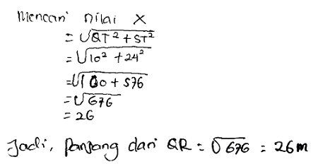 | S2 | : | It is known that TQ is 10 meters, so to find the hypotenuse, we need to use the concept of QR2=√(QT2+ ST2)=√(102+242 )=√(100+576)=√676 |