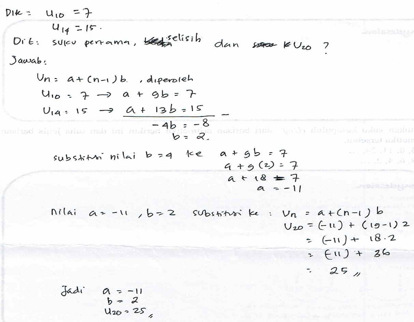 | S-1 | : To determine the first term and the difference, re-expand the known sequence, that , U10=7 and U14=15, so that we will obtain the first term and the difference. The 20th term is obtained from the Un formula. I'm sure the answer is correct, Miss. |