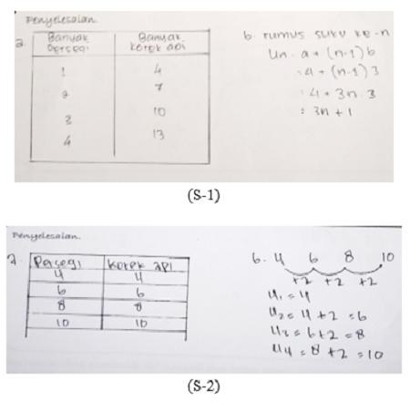At the fifth lesson, the indicator linking various concepts (internal and external mathematics) and applying the concepts algorithmically were measured through a problem related to the pattern of the square numbers (Table 1). S-1 and S-2 solved problem 5 (Figure 5). The students’ answers (Figure 5) and the interview indicate that S-1 was able to state the relationship between the number of squares and matchstick. While S-2 was not able to express the relationship leading to incorrectly show the number pattern where each term contains a square formed by the arrangement of matches images. The incorrect number pattern caused the error in solving the n-term formula. It can be concluded that S-1 solved the problem and fulfilled the indicators, while S-2 did not, as shown in the interview excerpt below.