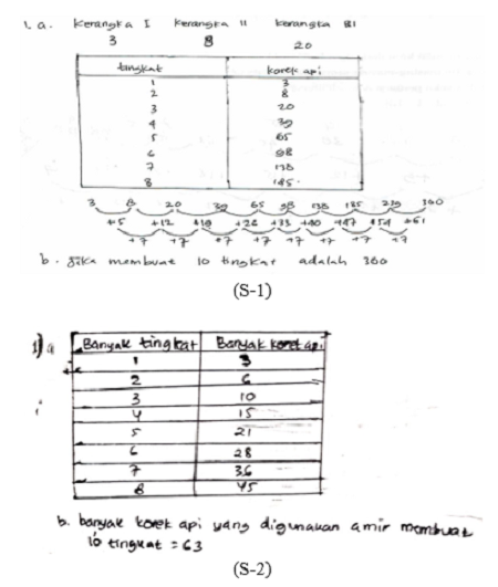 At the first lesson, the indicator applying concepts algorithmically was measured through the problem related to triangular numbers pattern (Table 1). S-1 and S-2 solved problem 1 (Figure 1) as follows.