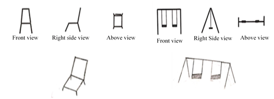 Figure 3 and transcript 5 show FS made observations and identification on an object based on the information. She looked at the schematic view from the front, right side, and top view and then related the known image with the unknown on the problem to imagine an ordinary chair. Furthermore, FS could combine elements along with spatial relationships between objects to form a chair. However, she did not know the chair's representation exactly whether the same as the right image. Figure 3 reveals a discrepancy between the FS's image and the scheme's front view and top view. Consequently, she could not conclude a new object accurately obtained from synthesizing the three-view schema.