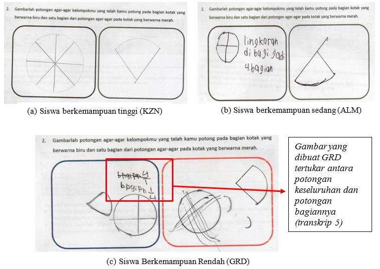 Siswa berkemampuan tinggi dan sedang dapat mengkonstruksi model of dengan baik seperti disajikan pada Gambar 2 (a dan b). Perbedaan ukuran antara gambar seluruh potongan agar-agar (kotak biru) dan gambar bagian agar-agar yang meraka dapatkan (kotak merah) tidak mempengaruhi pemahaman siswa tentang konsep bagian-keseluruhan dari sebuah pecahan. Berikut kutipan percakapan antara guru dan siswa melalui dokumentasi video.