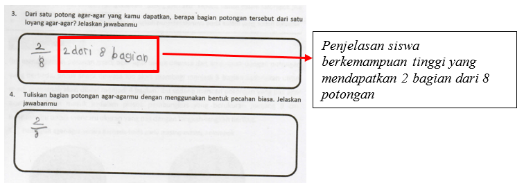 Gambar 3 menyajikan jawaban siswa berkemampuan tinggi (KZN) yang menjawab nomor 3 dengan tepat dan disertai penjelasan. KZN telah menujukkan pemahaman tentang konsep bagian-keseluruhan dari 2/8, dimana yang didapatkan oleh KZN adalah dua bagian agar-agar dari delapan potong lainnya (Transkrip 1, baris-3). Hal ini berdampak KZN menjawab dengan benar pertanyaan pada nomor 4.