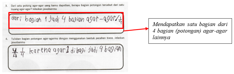 Hal yang serupa disajikan oleh siswa dengan kemampuan sedang (ALM), dimana mendapatkan satu bagian dari 4 potongan agar-agar (Transkrip 2, baris-2 dan baris-4). Gambar 4 menyajikan jawaban siswa berkemampuan sedang yang menjawab nomor 3 dengan tepat dan disertai penjelasan. Jawaban pertama yang disajikan oleh siswa berkemampuan sedang adalah 4/4 untuk kemudian diganti menjadi 1/4 dan disertai dengan penjelasan. Hal ini terjadi karena siswa belum memahami dengan jelas perintah yang disajikan pada soal (Transkrip 2, baris-11 sampai baris-14).