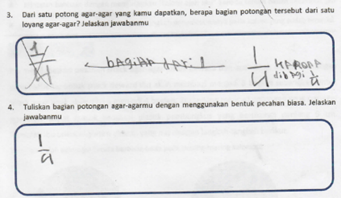Sementara itu, siswa dengan kemampuan rendah (GRD) selalu menarik perhatian untuk memahami konstruksi berfikirnya. Jawaban siswa dengan kemampuan rendah dapat dilihat pada Gambar 2 (c) dan Gambar 5, dimana siswa mencoret jawaban pertama yang menuliskan “1/4, bagian dari 1” diganti menjadi “1/4 karena dibagi 1/4“. GRD memahami bahwa ketika memotong satu loyang agar-agar menjadi empat bagian yaitu membagi menjadi satu per empat (Transkrip 3, baris-4). Beberapa kali guru melakukan konfirmasi terkait pemahaman GRD, ditemukan bahwa GRD tidak memahami pecahan 1/4 memiliki makna satu bagian dari empat potongan lainnya (Transkrip 3, baris-4 sampai baris-12). Hal ini berkaitan dengan dengan jawaban siswa berkemampuan rendah pada nomor 2 dan dapat disimpulkan bahwa siswa ini sudah mengenal tentang pecahan dan bentuk-bentuknya, namun belum memahami konsep dari pecahan sebagai bagian-keseluruhan.
