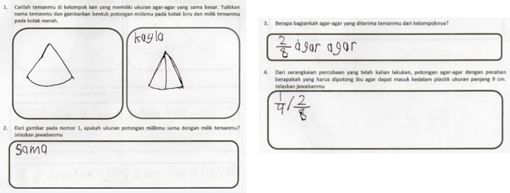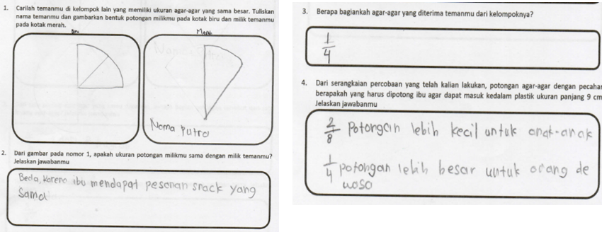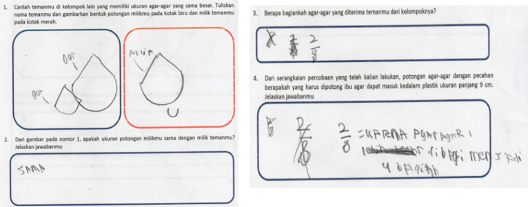Beberapa catatan yang kami temukan dari instruksi yang telah kami desain. Pertama, kami tidak mampu membuat dugaan bagaimana siswa melakukan pemotongan agar-agar pada aktiviats pertama, sehingga siswa menggunakan alat bantu seadanya seperti buku dan sterofoam untuk memotong agar-agar. Kedua, kami tidak menyediakan alat bantu ketika siswa menggambar replika agar-agar pada aktivitas pertama nomor 2, sehingga siswa menggunakan alat bantu seadanya seperti tutup botol minuman. Namun, hal ini dapat dipandang sebagai kreativitas siswa. Ketiga, kelemahan menggunakan konteks agar-agar ketika siswa diminta untuk mengambarkan dua potongan agar-agar milik temannya dengan ukuran yang sama (aktivitas kedua nomor 1). Instruksi akan lebih jelas dan mudah dipahami siswa jika ditambahkan ukuran yang sama meskpun berbeda jumlah potongan. Meskipun demikian, agar-agar telah menjadi objek konkrit yang sesuai dengan karakteristik siswa dalam memahami pecahan senilai.