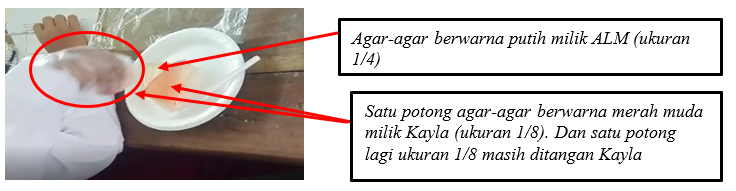 Baris-12 Siswa ALM : Itu tadi bu, Aku kira ditulis lagi bu (menunjuk semua potongan agar-agar)