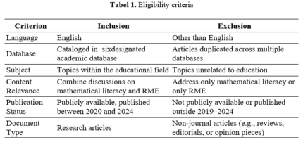 [English]: This systematic literature review (SLR) explores the relationship between mathematical literacy and the Realistic Mathematics Education (RME) approach, which emphasizes the use of real-world contexts in mathematics instruction. This review was conducted following the PRISMA (Preferred Reporting Items for Systematic Reviews and Meta-Analyses) guidelines to ensure transparency and rigor in the selection, analysis, and synthesis of relevant studies. The review examines studies published between 2019 and 2024, focusing on trends, research methodologies, and the effectiveness of RME in enhancing students' mathematical literacy. The evidence suggests a potential relationship between the implementation of RME and students tendencies to demonstrate a better grasp of mathematical concepts, as well as a stronger inclination toward solving problems in context-based settings. These findings, while drawn from limited and non-randomized studies, suggest that RME may be associated with more meaningful student engagement in mathematics.The review also identifies the research instruments frequently used in RME-related studies and highlights the importance of contextualized learning in promoting mathematical literacy. Despite challenges, such as the need for more innovative, contextually relevant learning designs and the adaptation of RME across various educational settings, the approach has proven to be an effective strategy for advancing students' mathematical literacy, critical thinking, and problem-solving abilities. These findings contribute to the growing body of research that advocates for context-driven approaches in mathematics education.